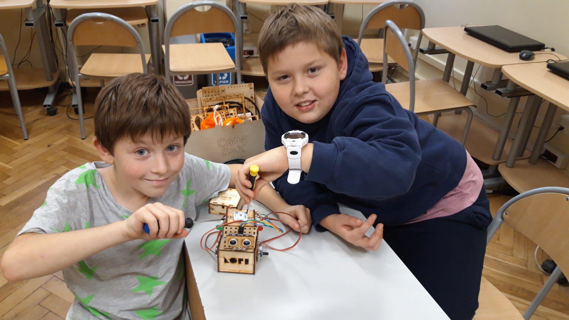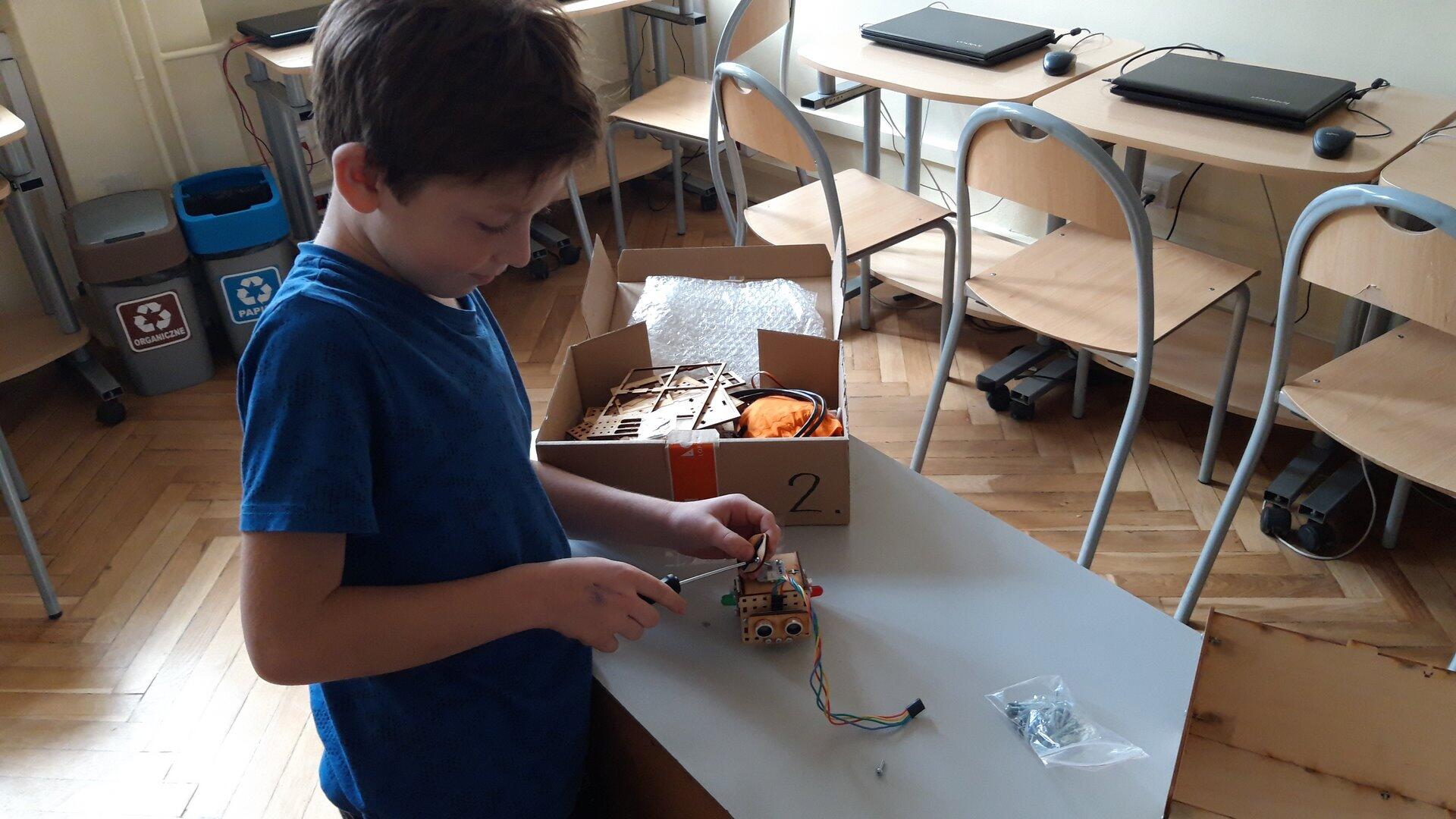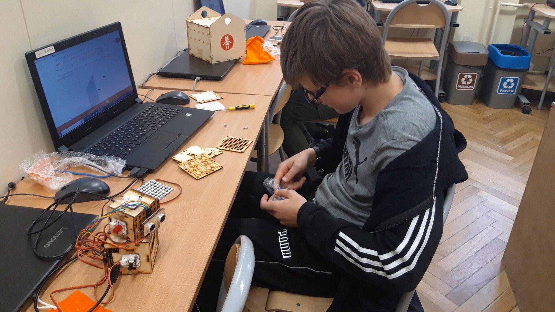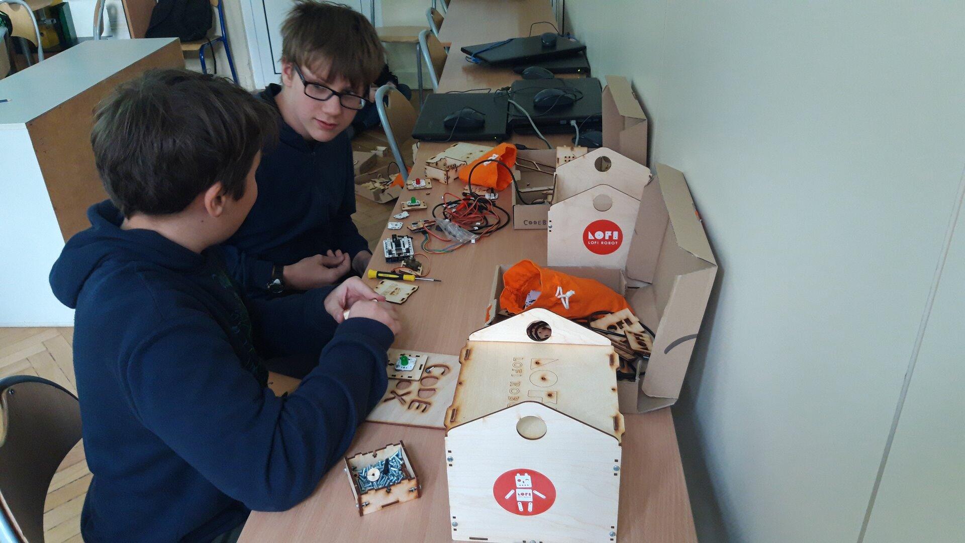 Na pierwszych zajęciach z robotyki dowiedzieliśmy się czym jest robot oraz jaka jest różnica między maszyną, a robotem. Omówiliśmy z jakich części będzie składał się "Głowacz", którego następnie konstrułowaliśmy przez cały miesiąc. Zbudowaliśmy również domki dla naszych robotów. Podczas pracy było nam potrzebnych mnóstwo śrubek, dla których skręciliśmy pudełko, żeby ich nie pogubić :) Majterkowanie już za nami pora na programowanie.