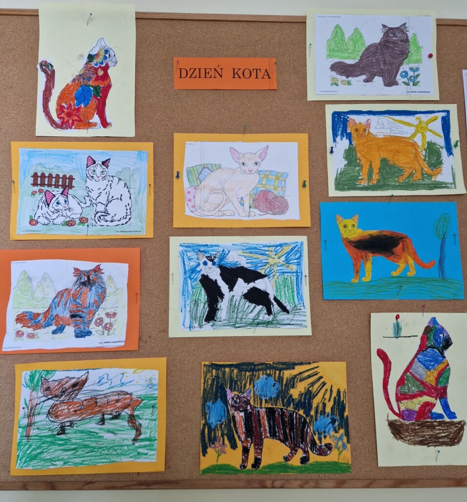 Z okazji Dnia Kota dzieci poznały ciekawostki na temat kotów. Opowiadały o ich zwyczajach i rodzajach ich umaszczenia. Wykorzystując wyobraźnię pięknie narysowały różne koty.