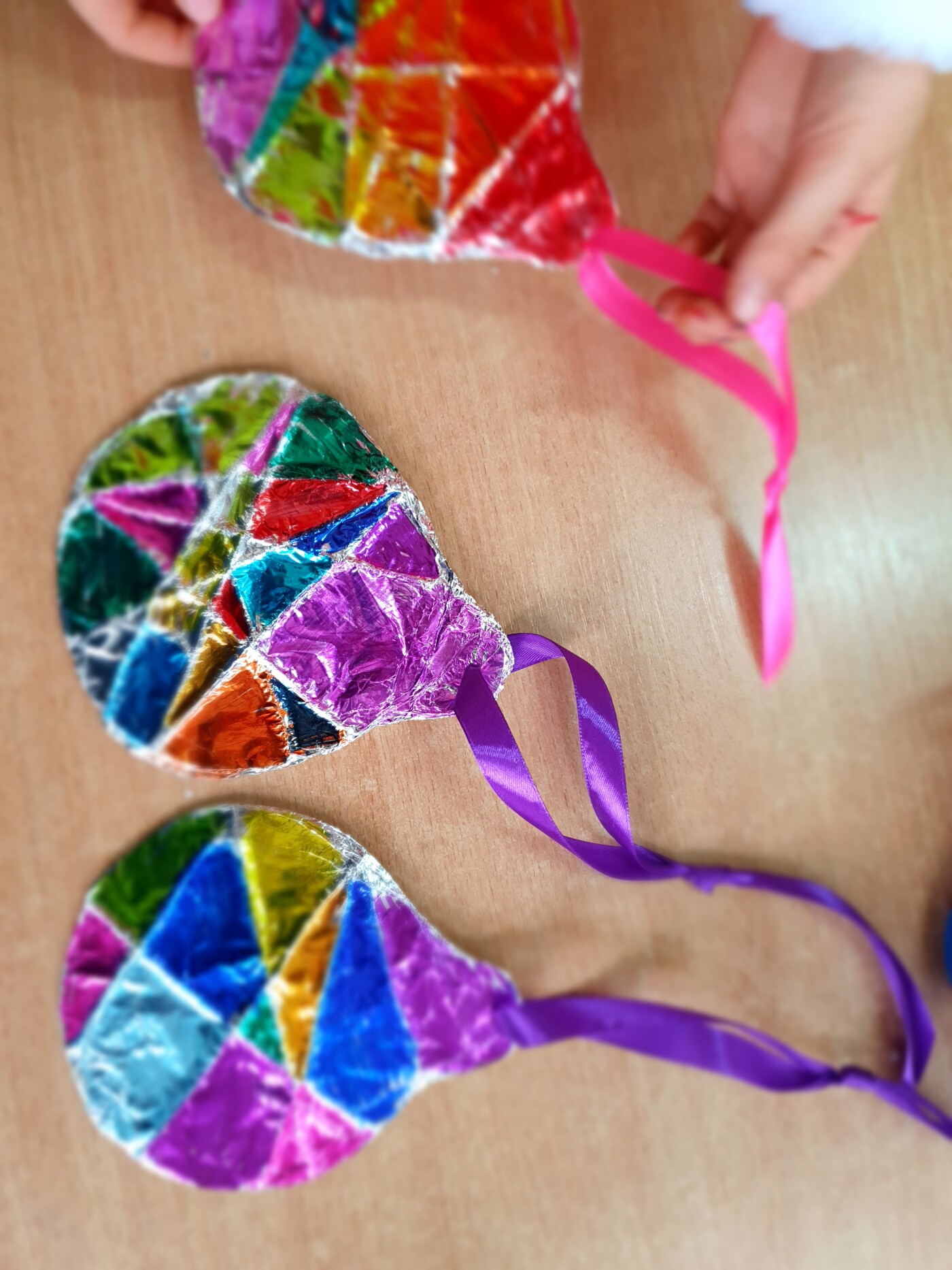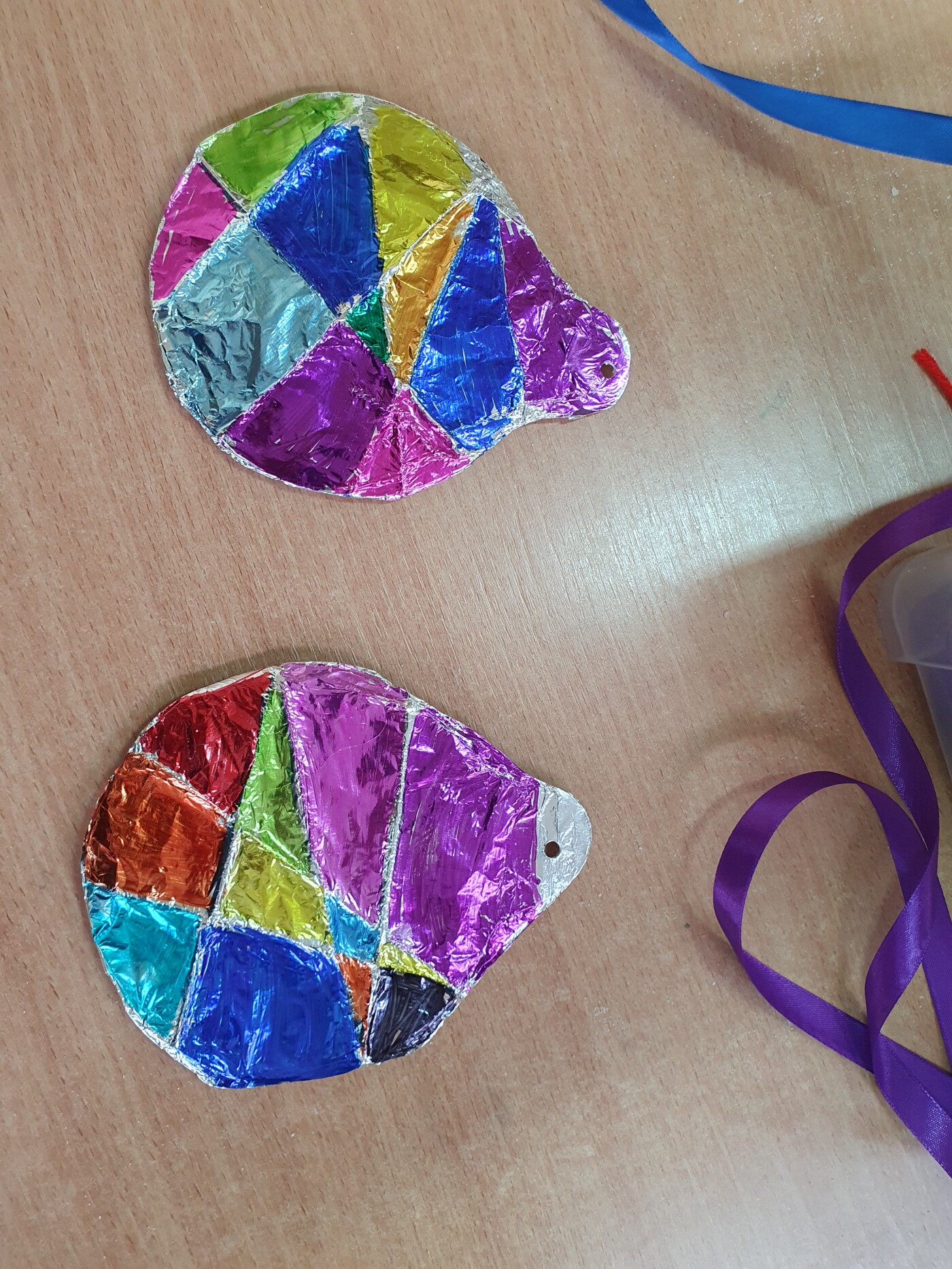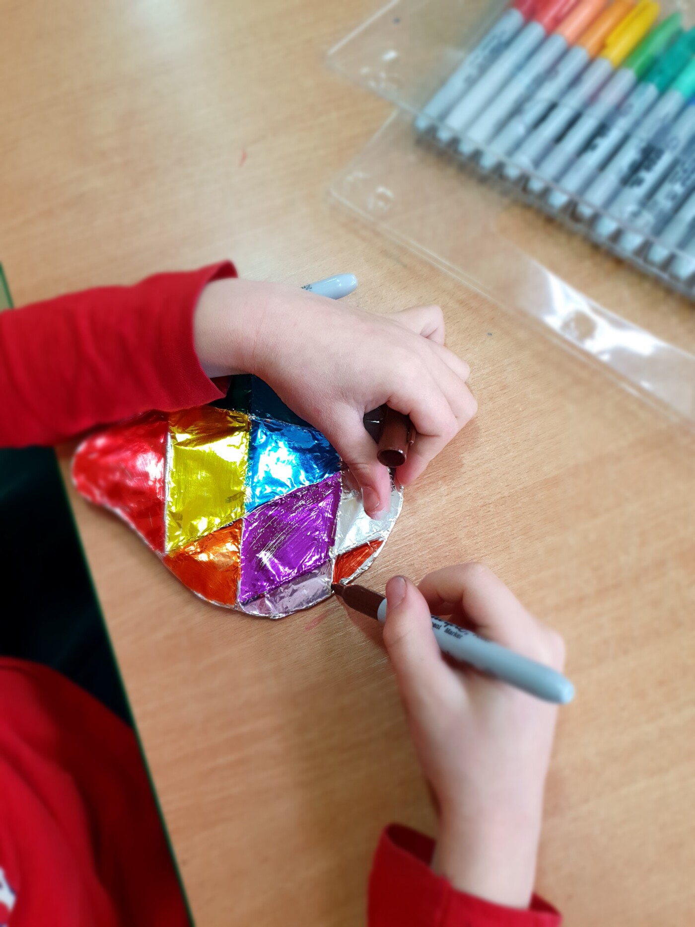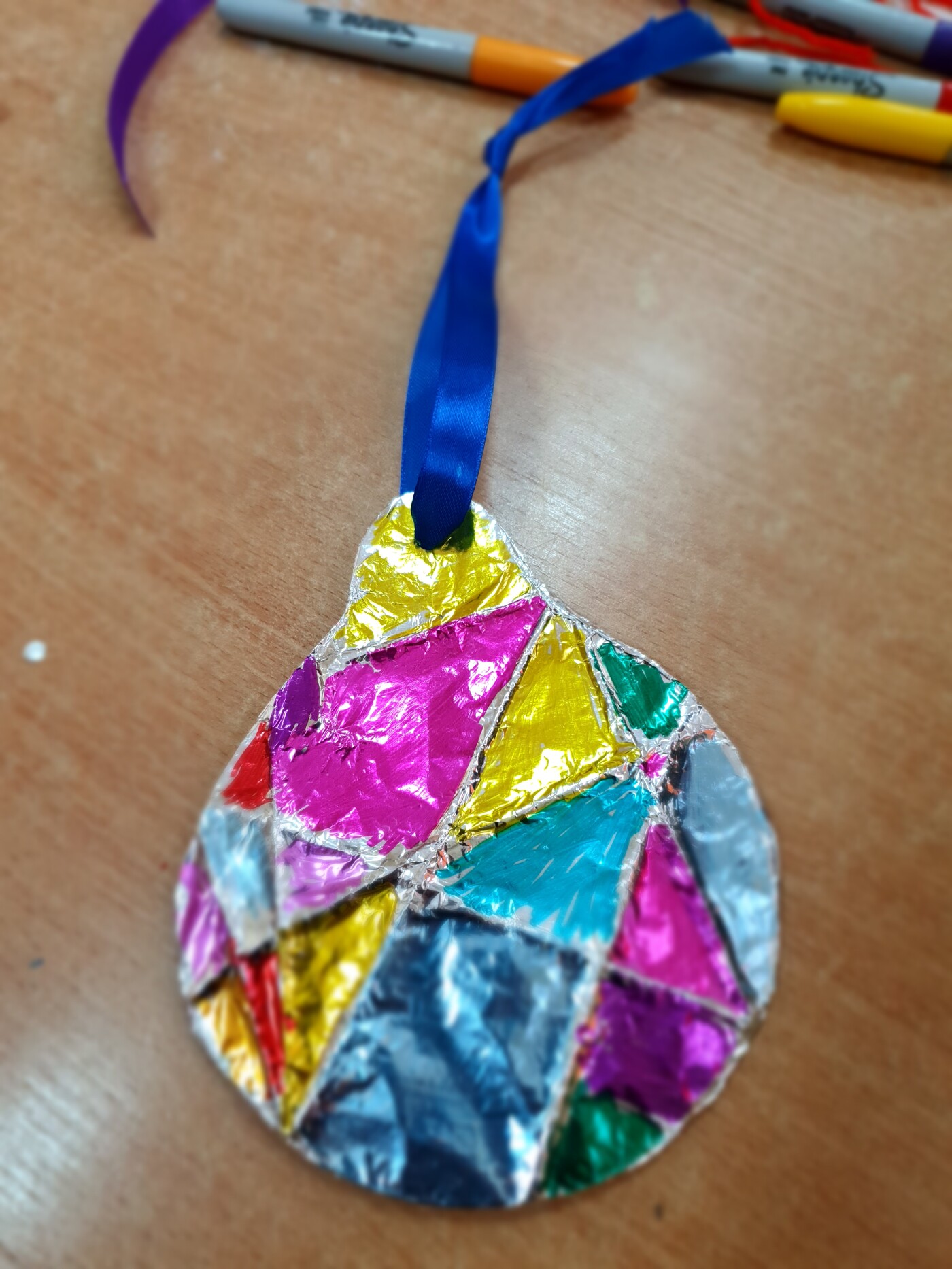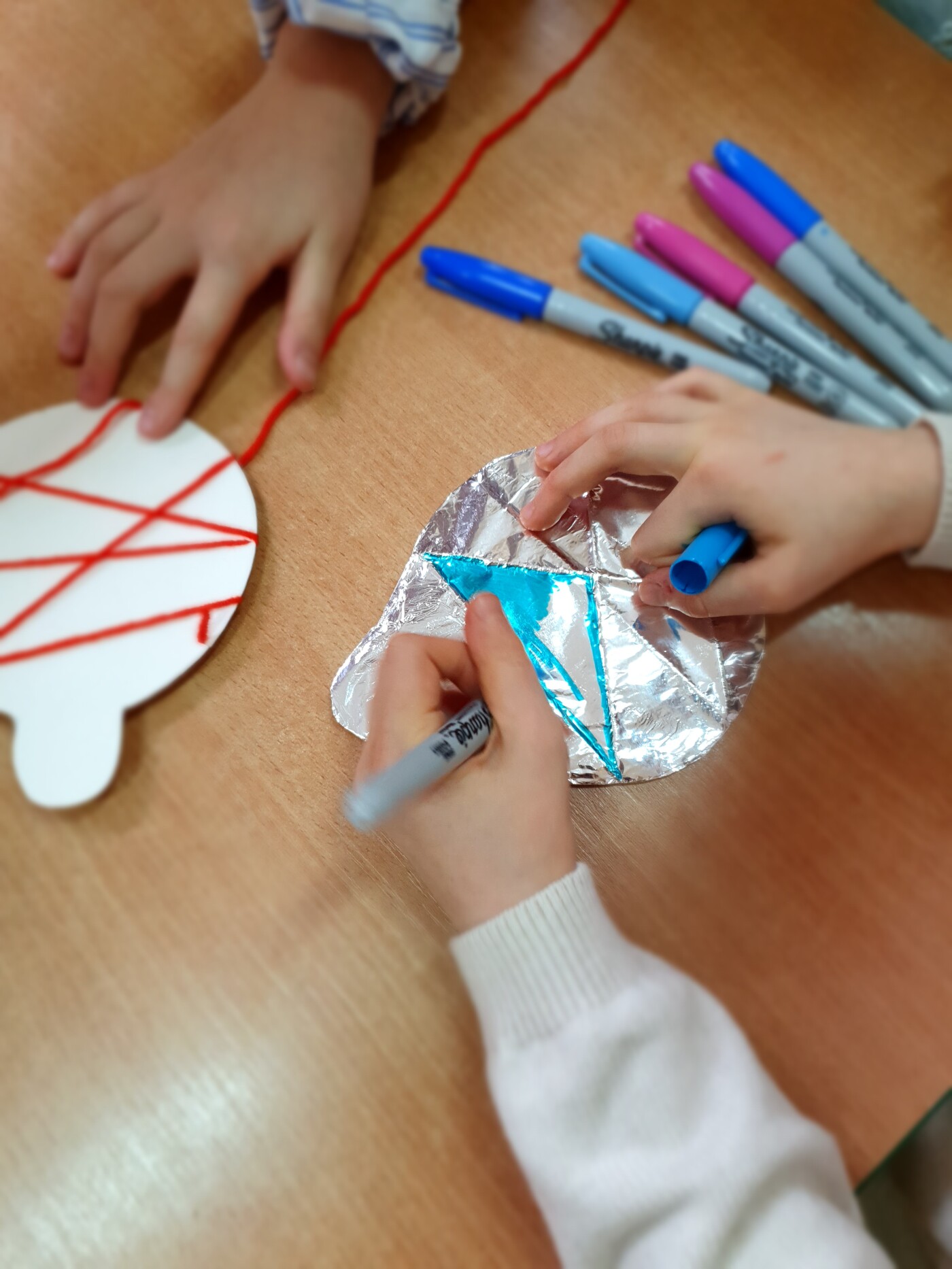 Kolejnym zadaniem było wykonanie bombek w witrażowej odsłonie. Uczniowie stworzyli oryginalne ozdoby z kartonu, sznurka oraz folii aluminiowej. Kartonowe formy były obwiązywane sznurkiem, a następnie owijane folią, co pozwoliło uzyskać wyraźne kontury przypominające linie witrażu. Następnie bombki zostały pomalowane flamastrami dzięki czemu powstały barwne, efektowne prace pełne światła i kontrastów.