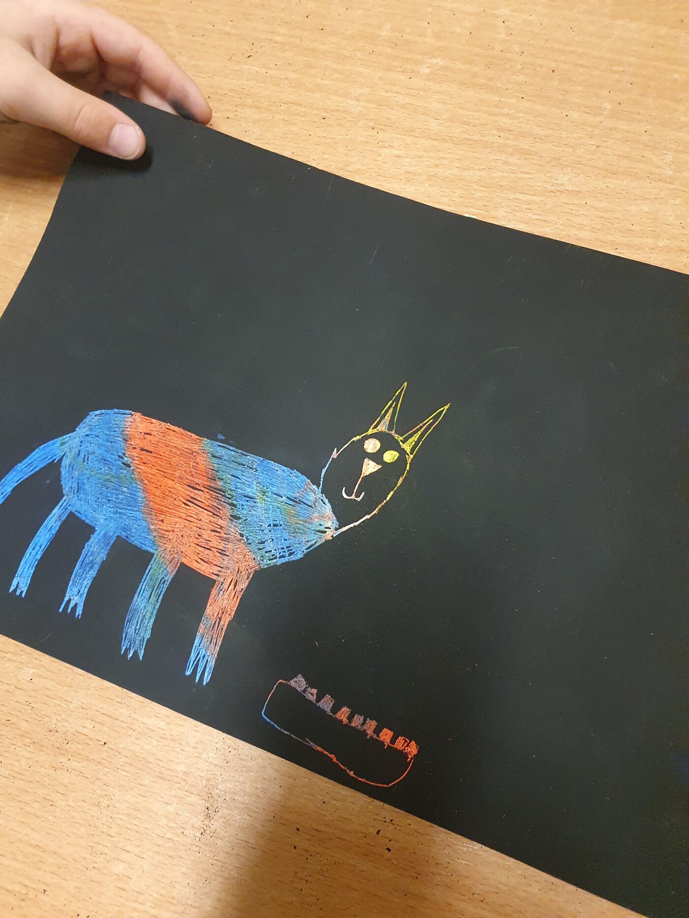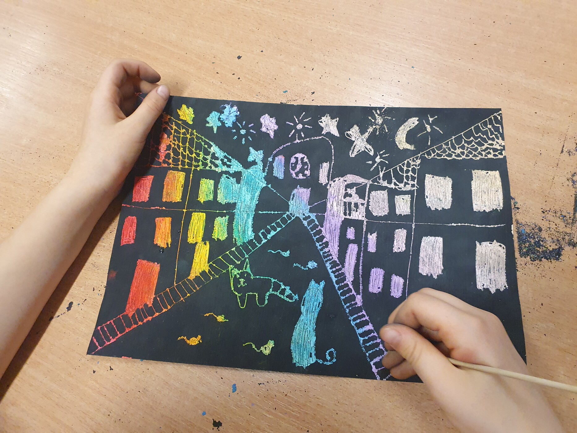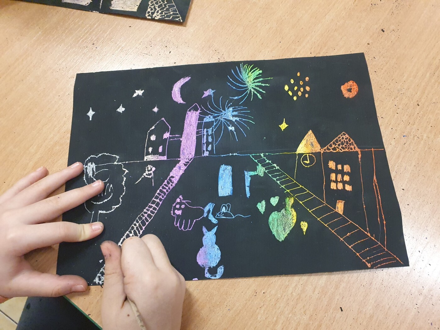Podczas zajęć koła plastycznego „Radość tworzenia” uczniowie mieli okazję poznać ciekawą i efektowną technikę plastyczną – wydrapywankę. Każdy uczestnik samodzielnie przygotował swoje podłoże do pracy. Na białą kartkę brystolu dzieci dokładnie naniosły grubą warstwę tłustych pasteli w wyrazistych kolorach. Następnie całość została starannie pokryta czarną farbą. Gdy farba wyschła, rozpoczęła się najciekawsza część pracy – wydrapywanie obrazków za pomocą patyczków szaszłykowych. Z pomocą delikatnych ruchów uczniowie odkrywali spod czarnej powierzchni ukryte, barwne kolory. Na kartkach powstawały oryginalne obrazki - m.in. koty, miasto nocą czy postacie z gier.