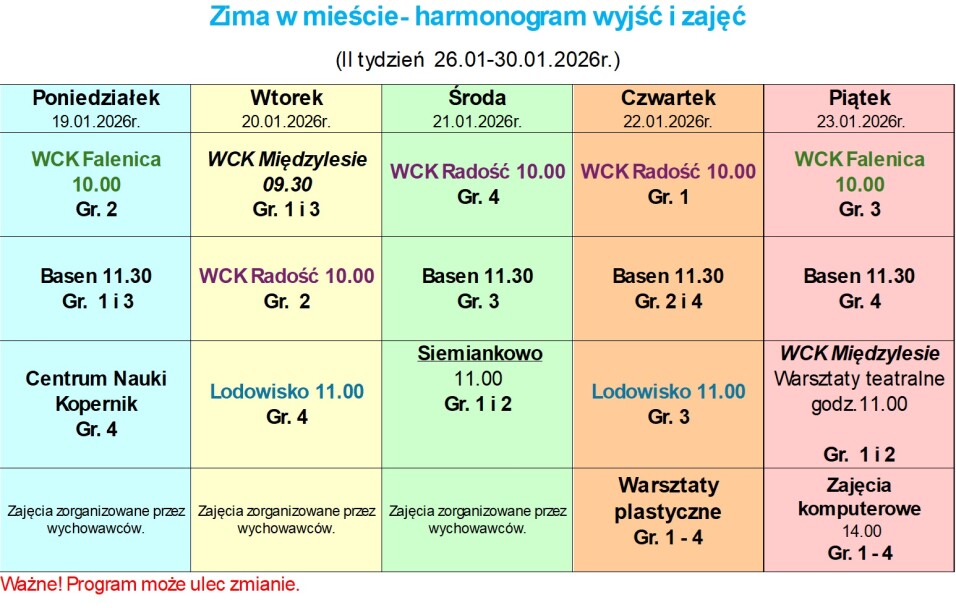 Zima w mieście - harmonogram zajęć - 26-30.01